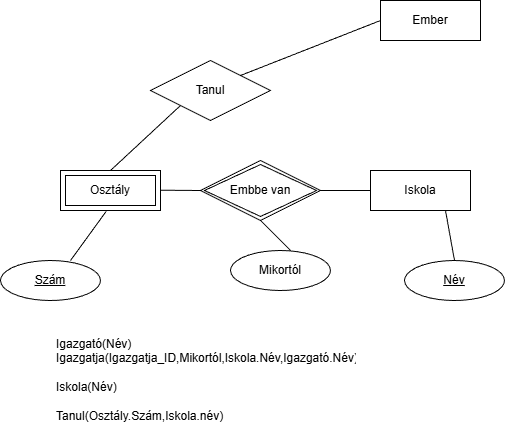 An example ER diagram for the databases subject for teaching purposes. Hungarian version only