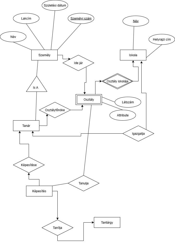 - Nézet (View): felhasználó az adatbázisból lát, több felhasználási lehetőség → több nézet, ehhez tartozó séma: külső séma. Fontos, hogy ez csak származtatja az adatokat.