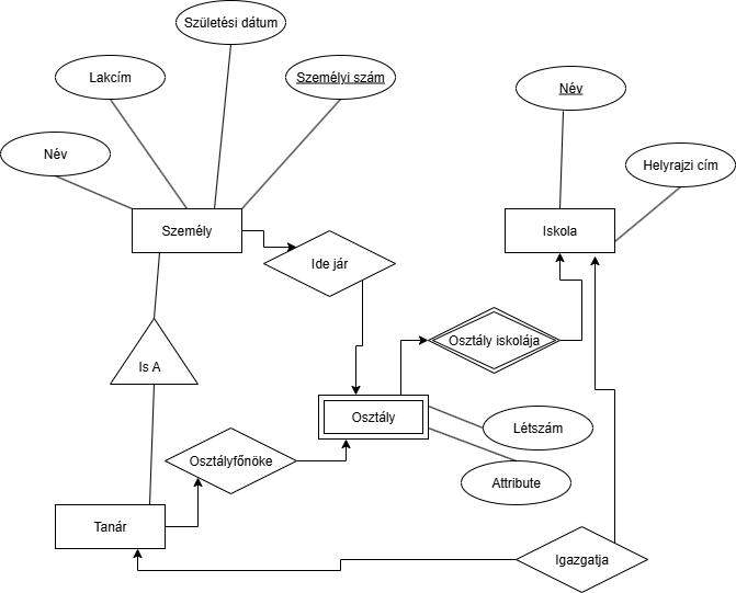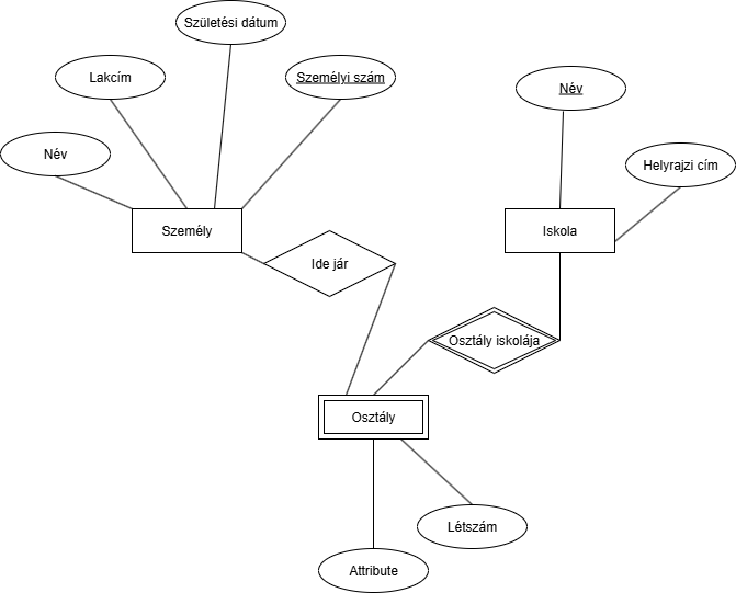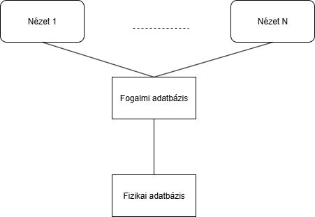 - Nézet (View): felhasználó az adatbázisból lát, több felhasználási lehetőség → több nézet, ehhez tartozó séma: külső séma. Fontos, hogy ez csak származtatja az adatokat.